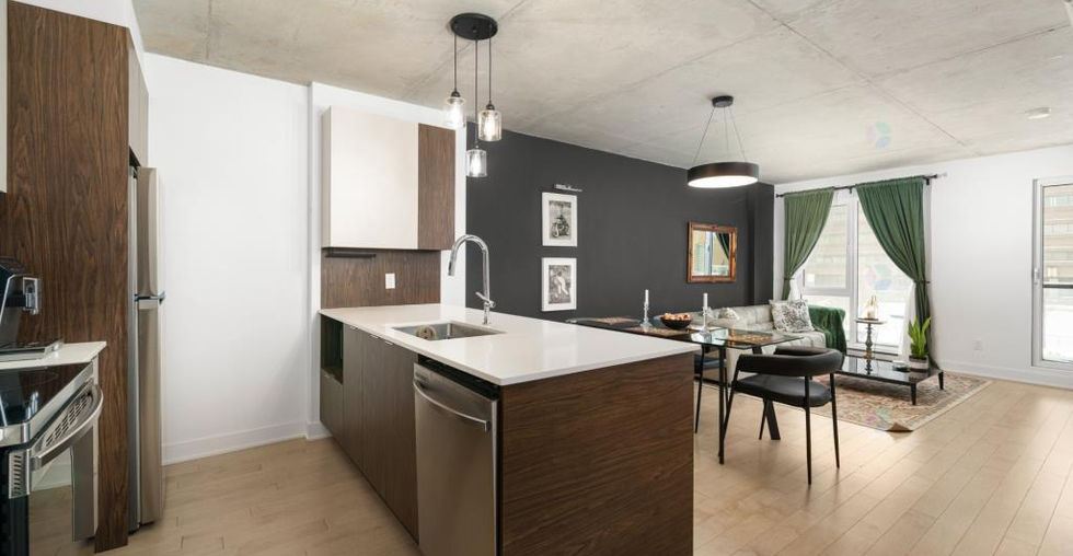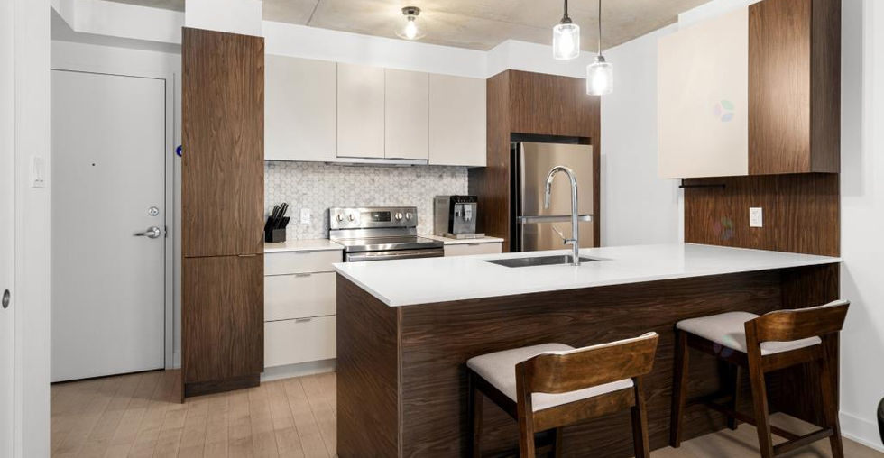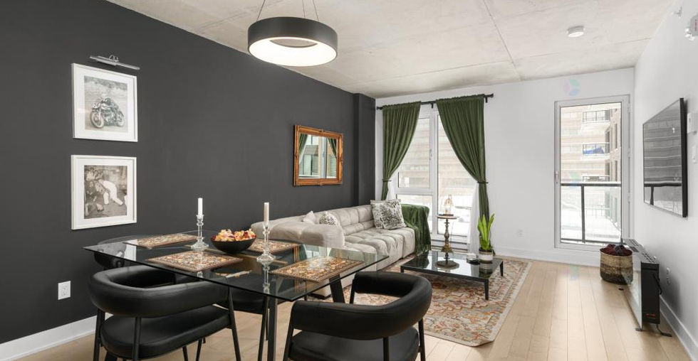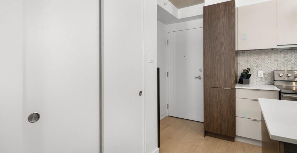 Contemporary 2-bedroom condo in the prestigious Le Quatrième project, featuring exposed concrete ceilings, a modern kitchen with quartz countertops, floor-to-ceiling windows, high-end appliances, and an elegant bathroom. Includes indoor parking and a storage unit. Its ouest orientation ensures abundant natural light and a tranquil view of the interior courtyard. Enjoy amenities such as a heated saltwater pool overlooking Lake Saint-Louis, an urban chalet, a terrace with a BBQ, and a state-of-the-art fitness center.